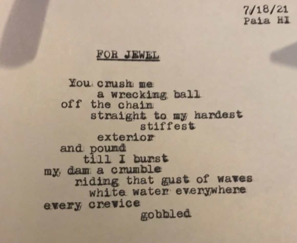 He wanted a short poem for his girl. She loves sex and surfing. “She’s a force”.